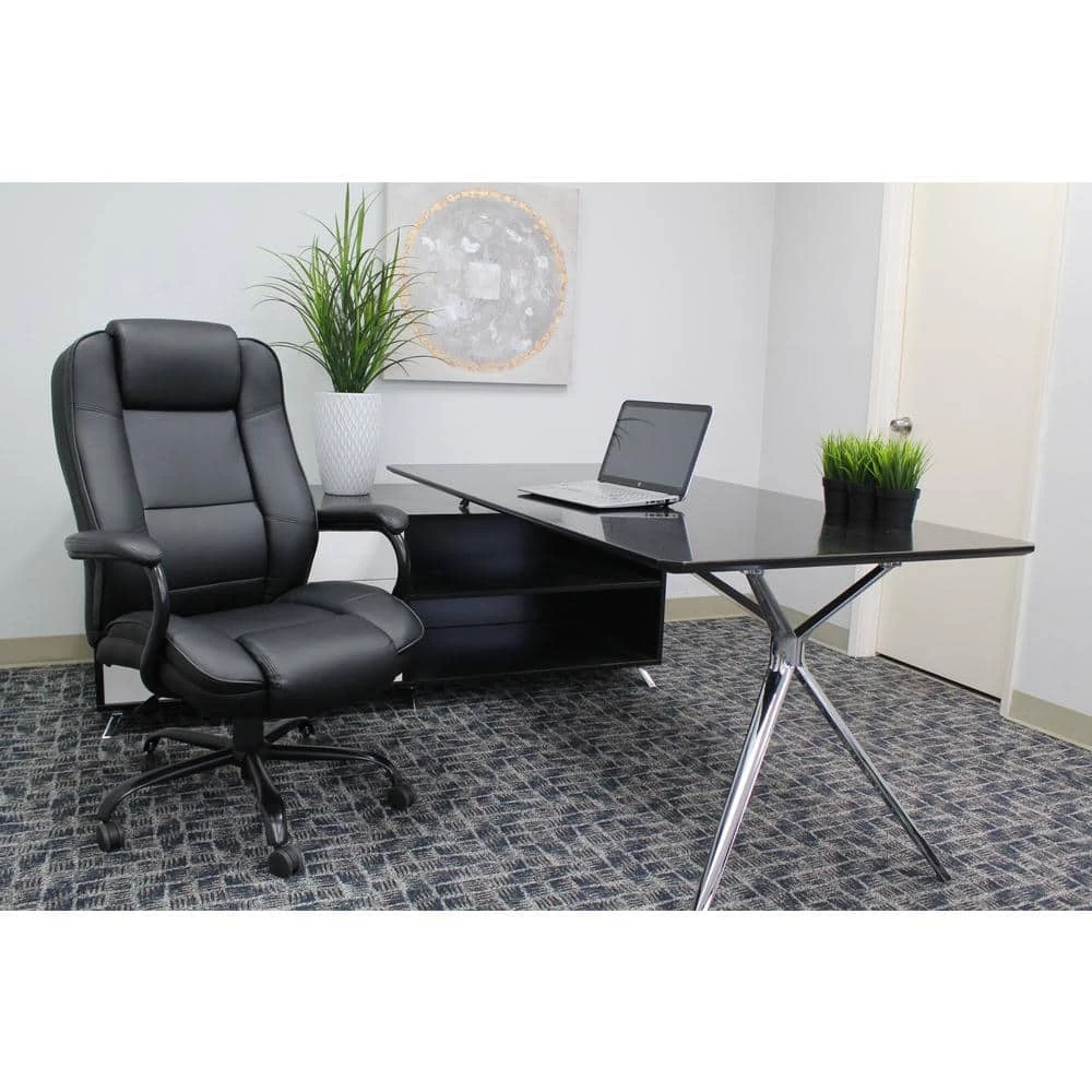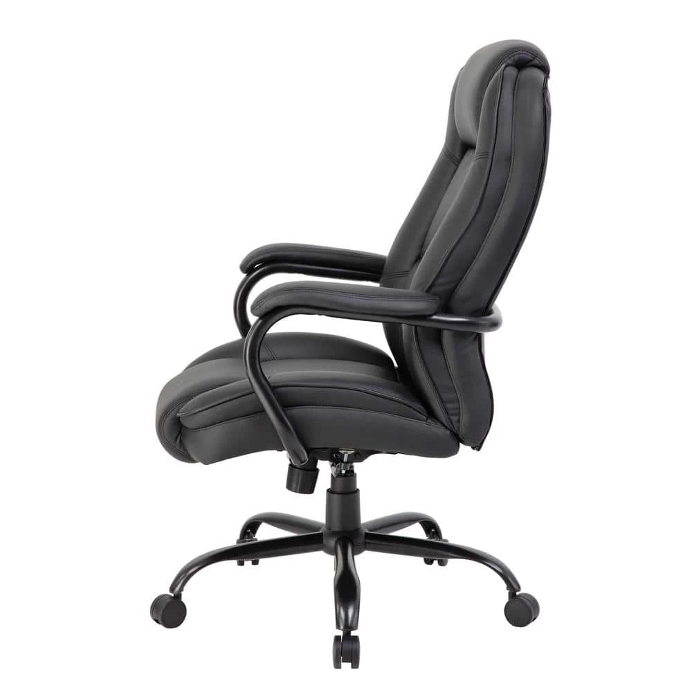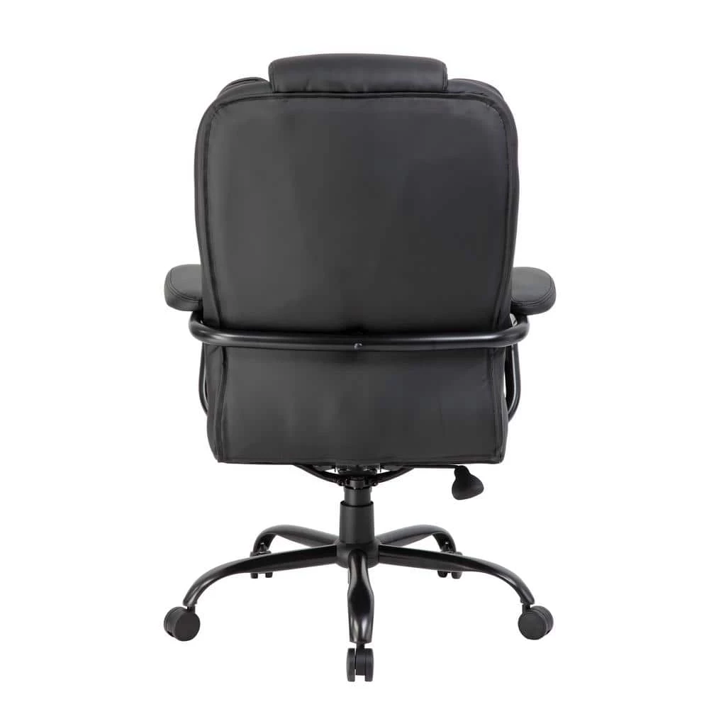 400 lb. weight capacity. Upholstered in Black Leather Plus. Leather Plus is leather and polyurethane for added softness and durability. Padded arms incorporated into steel wrap around style construction. Reinforced lumbar. Heavy duty spring tilt mechanism.