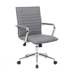 Upholstered in Gray vinyl. Ribbed cushion design. Chrome fixed arms with covered arm rests. Spring tilt mechanism. Upright locking position. Pneumatic gas lift seat height adjustment. 25 in. chrome base. Hooded double wheel casters.